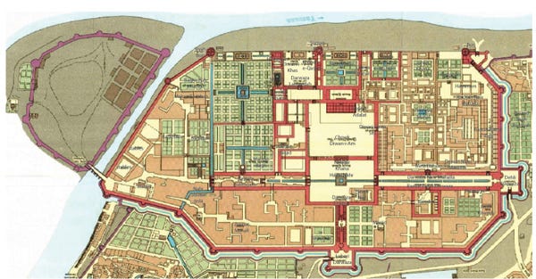 The Mughals conceived the city, in accordance with traditional Islamic theories of architecture, as the meeting point of heaven and earth. The city was situated between the two major poles of man and the cosmos, therefore becoming a sacred centre that encompassed the empire and the universe. By extension, the emperor also had an elevated significance, being the symbolic centre in the hierarchy of City, Empire, Universe. The capital city of Shahjahanabad, built in 1638, expressed this belief in its plan that was monumentally laid out alongside some Hindu influences, with the city symbolising the cosmos and its eight massive gates, the four cardinal directions and the four gates of heaven. The main boulevard of Chandni Chowk lead from the Emperor’s fortress-palace, which was in itself a city within the city, to the Fatehpuri mosque at the other end, flanked by other boulevards and avenues running across the plan. The boulevards, although active and redeveloped today to incorporate other uses, were marked by axial symmetry, from the fortress-palace, past symmetrical sculptures and buildings to the mosque which is also a composition along the processional axis. Partially destroyed and redone by the British, and subsequently by governments, today, when they are seen as part of one continuous movement, the individual bays of buildings may not have harmonic proportions and symmetry, but like music, they do hold a rhythmic relation within themselves. The strange thing about such architecture, or even edifice, is that despite changes and alternations, it retains the effect of solemn procession and its sanctity.