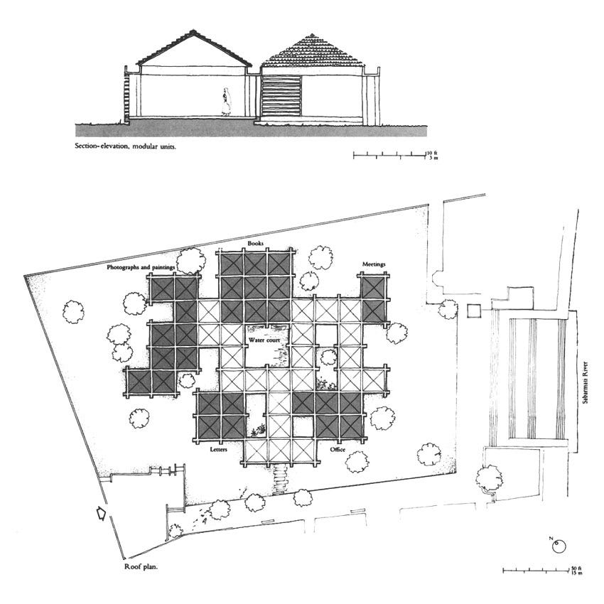 Sabarmati Ashram, Ahmedabad designed by Charles Correa in the 1960s is, but dramatic for its familiarity. It is a physical interpretation of Mahatma Gandhi’s values and philosophies in an already built work, embodying the ideals of simplicity and frugality. A modest and humanly-scaled building, it uses brick piers, stone floors and tiled roofs to realise a contemporary expression for the spirit of swadesi, the encouragement of domestic production and boycott of foreign goods as part of the campaign for independence. Made of reinforced concrete cement, the building consists of modular units measuring 6 metre x 6 metre, connecting spaces that are both open and closed, granting variety in each module’s lighting, temperature and visual permeability. There are winding pathways progressing towards the central water courtyard, around which the rooms are arranged in a simple post and beam structure with load-bearing columns supporting the concrete channels and wooden roof, directing rainwater with boards nailed underneath the joists and tiles placed atop. The planning is similar to a rural Indian village where houses are divided functionally around a courtyard that needs to be traversed each time, making it the most social and public place. Recalling the words of Mahatma Gandhi, “I don’t want my house to be walled on four sides and my windows to be stuffed. I want cultures of all the land to be blown about my houses as freely as possible but I refuse to be blown off my feet by any of them”, the ashram is a spectacular interpretation of an Indian, swadesi identity.