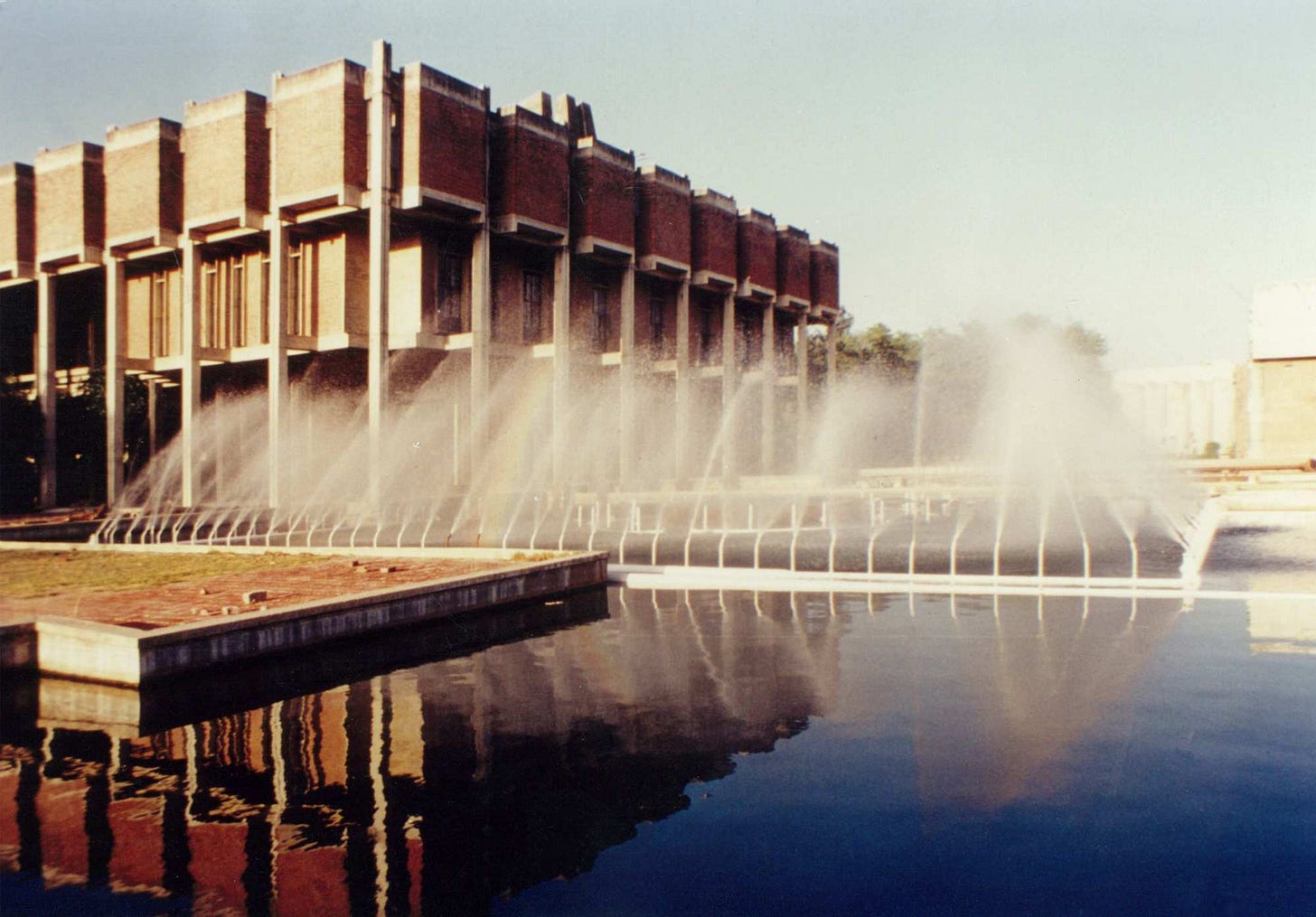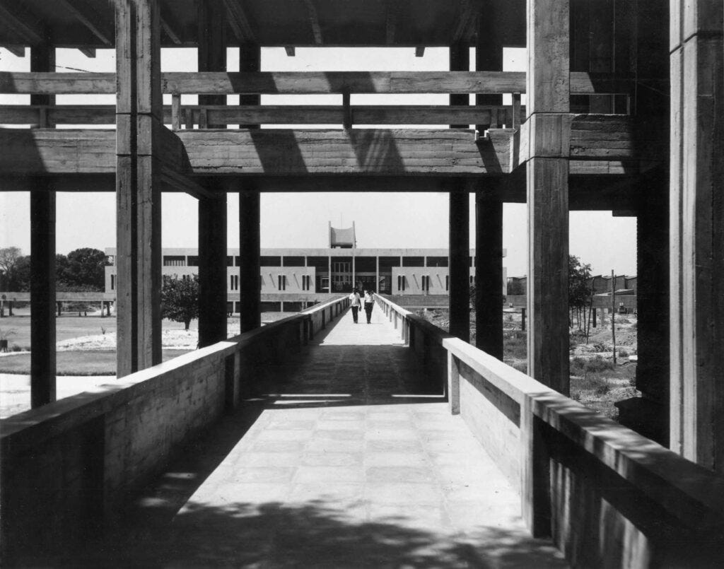 In the 1950s, a building that played a pivotal role in establishing the direction for Indian architecture and the development of its modern heritage was IIT (Indian Institute of Technology) Kanpur designed by Achyut Kanvinde. It introduced a novel idea of multiple disciplines working together to provide an integrated curriculum marked by interconnectedness and flexibility. The building form consists of hierarchical elements that create a system like a human body, based on a 5-minute walking distance - the skeleton being the building framework; muscles, the connecting spaces; the circulatory system, the pedestrian pathways and roads; the administrative block being the brain and the heart, the central plaza with the library. The entire campus follows a 5 metre square grid plan. Decentralising the form allowed for smaller comprehensible clusters centred around a two-level circulation spine, that allowed for future expansion as well. Built in modular solids, blocks, punctures, voids and networks, the building is constructed in local materials of bricks and reinforced concrete cement, along with the newness of using louvres and sun breakers. Landscaping is minimal to emphasise the built form.